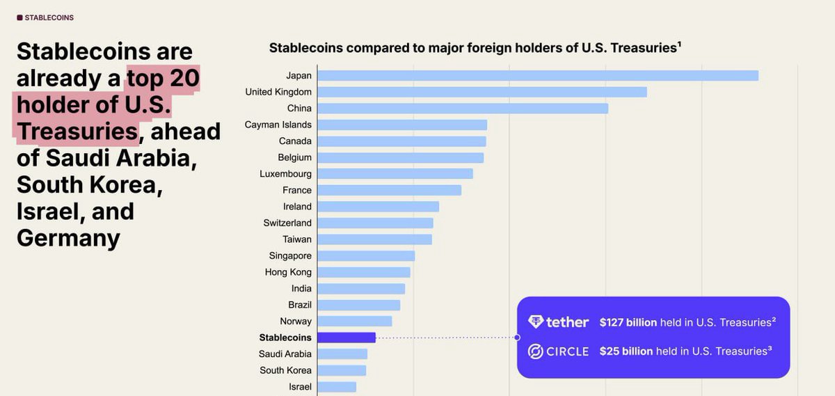 グラフィックの比較は、ステーブルコインがどれほど急速にランキングを上昇させてきたかを示しています。彼らの総保有量は、米国債市場に深い歴史的なつながりを持ついくつかの長年の外国買い手を上回っています。