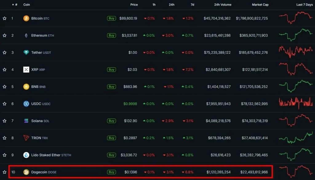 DOGEは$0.14付近で取引されており、時価総額約$225億でトップ10を維持しています。