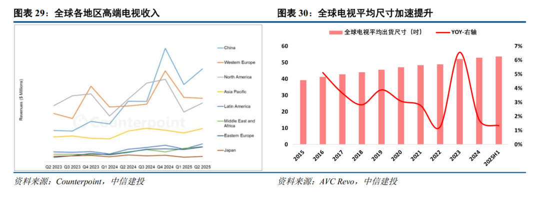高級化と大型化の構造アップグレードのトレンドが顕著であり、ブランドの利益率向上を促進しています。DSCCのデータによると、2025年第2四半期の世界の高級テレビ出荷台数と出荷額は、それぞれ前年比40%、21%の増加を示し、4四半期連続の前年比成長を記録しています。AVC Revoのデータによると、2025年前半の世界のテレビ出荷面積は72.2百万平方メートルに達し、前年比3.6%増加。平均出荷サイズは53.7インチで、2024年の53インチから拡大し続けており、世界的に大型テレビのトレンドが続いています。業界の製品構造の最適化が進む中、下流のブランドの利益率もさらに向上する見込みです。