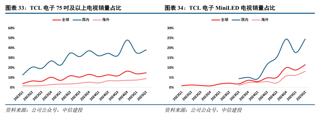 中国ブランドは高価格帯の市場シェアを獲得し、構造のアップグレードにより利益率も引き続き拡大しています。2025年第2四半期には、TCLの65インチ以上のテレビ出荷台数は前年比26.9%増加し、出荷比率は5.2ポイント上昇して29.1%に達しました。75インチ以上のテレビ出荷台数は前年比20.8%増加し、出荷比率も2ポイント上昇して14.7%となっています。2025年前半、TCLの平均出荷サイズは前年比1.5インチ増の53.4インチとなり、量子ドットテレビとMiniLEDテレビの世界出荷はそれぞれ73.7%、177.7%の増加を示しています。2024年第4四半期以降、サムスンのMiniLED出荷順位は4位に後退し、ハイセンス、TCL、シャオミなどの中国ブランドが、MiniLED技術の先行優位性とLCD分野でのコストパフォーマンスの高さを活かし、グローバル高級市場を席巻しています。大型・中高価格帯テレビの販売比率の増加により、製品構造の最適化が進み、ハイセンスとTCLの収益改善に寄与しています。
