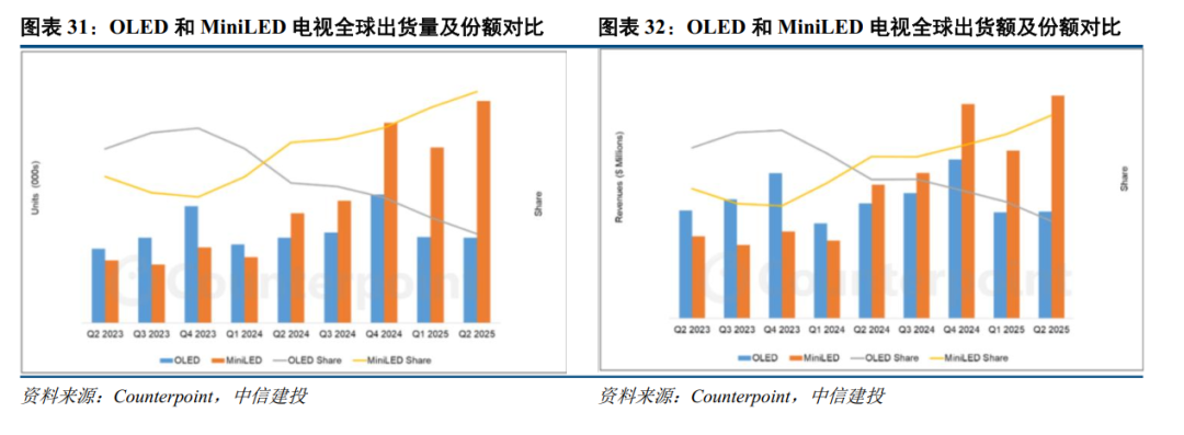 MiniLEDは高級市場でのシェアを拡大し続けており、OLEDの高級市場における重要性は低下しています。2023年にはOLEDが高級市場の出荷量と出荷額の60%以上を占めていましたが、2024年第2四半期にはMiniLEDがOLEDを超え、その後も高級市場でシェアを奪い合っています。2025年第2四半期には、MiniLEDテレビの出荷量と出荷額は前年比でそれぞれ101%、66%増加し、OLEDテレビの出荷量は横ばい、出荷額は7%減少しました。これは、MiniLEDのコストとコストパフォーマンスの向上によるもので、より多くの消費者がMiniLEDを選択し、中国ブランドが積極的に推進するMiniLEDテレビの普及が進んでいます。**