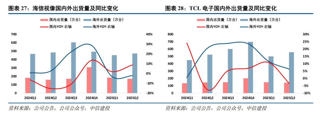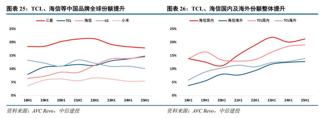 中信建投研報は、2025年の家電セクターは関税の引き上げや旧型交換政策の変動、そして下半期の高い基準値予想により、全体として上海・深圳株価指数(沪深300)を下回るパフォーマンスになると示しています。長期的な視点に立てば、企業の競争力は最終的に製品革新と効率性の本質に回帰するため、投資の観点から中信建投は主に二つの軸を考えています。一つは海外展開が引き続き最も重要な成長源であること、もう一つは変革による恩恵です。### 全文は以下の通りです**中信建投:家電の海外展開による恩恵と変革サイクル****2025年、家電セクターは関税の引き上げや旧型交換政策の変動、下半期の高い基準値予想により、全体として上海・深セン株価指数(沪深300)を下回るパフォーマンスが予想されます。長期的な視点に立てば、企業の競争力は最終的に製品革新と効率性の本質に回帰します。投資の観点からは、主に二つの軸があると考えています。一つは海外展開が引き続き最も重要な成長源であること、もう一つは変革による恩恵です。****白物家電:内需は徐々に圧力を受け、中国企業は海外展開を加速し、高級市場での地位も向上**国内販売の刺激効果は弱まりつつあり、輸出の見通しは改善しています。ロトゥテクノロジーのデータによると、2025年第2四半期と第3四半期の中国テレビ市場におけるブランド別出荷台数はそれぞれ前年比で2.1%、10.4%の減少となり、2025年第4四半期の前年比減少は15%以上に達すると予測されています。小売市場の落ち込みはさらに大きく、2025年の総出荷台数は前年比6.8%減少し、小売販売量は約10%の減少が見込まれます。2026年を展望すると、内需の圧力は引き続き続く可能性が高く、ロトゥテクノロジーは、市場が注目する「国補助金」政策が継続するか否かに関わらず、中国のテレビ市場は引き続き縮小し続けると見ています。もし国補助金に代わる他の施策が導入されれば、2026年の出荷総数は前年比6.2%の減少にとどまる見込みですが、刺激策が継続されなければ、前年比で10%以上の減少となる可能性が高いです。ただし、2026年はスポーツイベントの年であり、米国・カナダ・メキシコで開催されるワールドカップは海外のテレビ需要の増加と買い替えを促進します。海外市場の展開を強化することが中国テレビ企業の最優先課題となるでしょう。**TCLとハイセンスは国内外の市場シェアを拡大しており、海外にはまだ大きな成長余地があります。AVC Revoのデータによると、2025年前半のハイセンスとTCLの世界出荷台数はそれぞれ1300万台超で、世界市場シェアは14%以上に達し、前年同期比で約1ポイントの増加です。ハイセンスの国内外の市場シェアはそれぞれ21.1%、12.7%で、1.1ポイントと0.3ポイントの増加。TCLは国内18.9%、海外13.8%で、それぞれ0.5ポイントと1.1ポイントの上昇です。同時に、サムスンは世界で1600万台以上を出荷し、市場シェアは約18%に達し、前年同期比で0.5ポイントの減少となっています。サムスンの出荷は主に海外市場に集中しており、海外の市場シェアは約22%です。中国ブランドには依然として追い上げの余地があります。****国内の二大ブランドの海外生産能力は整備されており、2025年の出荷成長を牽引しています。グローバル市場の観点から見ると、サムスンの中低価格帯市場の失墜、LCDパネル事業の撤退、LGやソニーなど他の海外ブランドのシェア移譲により、中国ブランドのハイセンスとTCLは3年以内に世界市場のトップに立つと予測されています。AVC Revoによると、TCLは2025年に積極的な戦略を展開し、世界シェアの拡大を目指し、ハイセンスも積極的な出荷目標を維持しています。米国の関税リスクについて過度に懸念する必要はなく、ハイセンスとTCLは海外生産能力のリードを続けており、中国本土のファウンドリー(ONNやVIZIOなど)に依存するブランドの関税リスクやコスト圧力は高まる一方です。そのため、主要ブランド間の競争圧力は相対的に低下する可能性があります。****高級化と大型化の構造アップグレードのトレンドが顕著であり、ブランドの利益率向上を促進しています。DSCCのデータによると、2025年第2四半期の世界の高級テレビ出荷台数と出荷額は、それぞれ前年比40%、21%の増加を示し、4四半期連続の前年比成長を記録しています。AVC Revoのデータによると、2025年前半の世界のテレビ出荷面積は72.2百万平方メートルに達し、前年比3.6%増加。平均出荷サイズは53.7インチで、2024年の53インチから拡大し続けており、世界的に大型テレビのトレンドが続いています。業界の製品構造の最適化が進む中、下流のブランドの利益率もさらに向上する見込みです。****高級テレビ市場の変革:中国ブランドはMiniLEDテレビを積極的に推進**MiniLEDは高級市場でのシェアを拡大し続けており、OLEDの高級市場における重要性は低下しています。2023年にはOLEDが高級市場の出荷量と出荷額の60%以上を占めていましたが、2024年第2四半期にはMiniLEDがOLEDを超え、その後も高級市場で