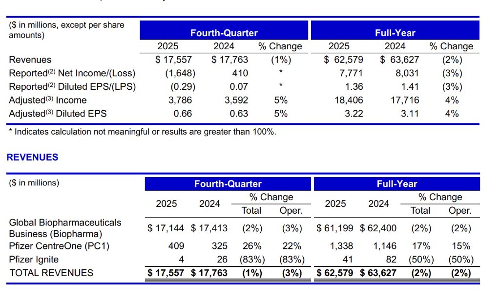 Looking at Q4 performance, revenue for the quarter was $17.6 billion; excluding COVID products, quarterly revenue increased by 9% year-over-year, further accelerating the growth rate compared to the full year. Adjusted EPS was $0.66, up 5% year-over-year, indicating ongoing optimization in cost control and operational efficiency. This “overall stability with a strengthening structure” characteristic precisely confirms that Pfizer is at a critical stage of transitioning from pandemic-related income to innovation-driven growth.