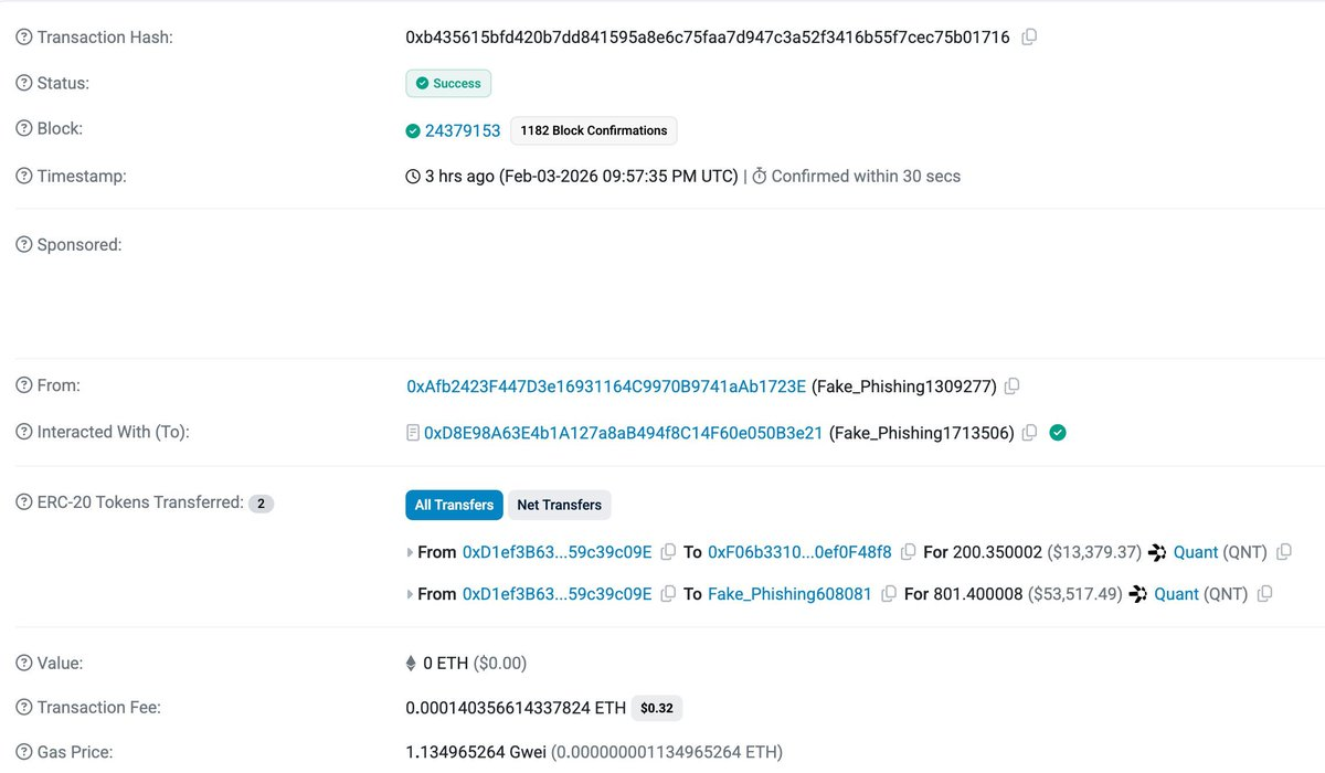 Deep Tide TechFlow News, February 4th, according to GoPlus Security monitoring, a wallet that has been inactive for nearly five years was compromised after signing a malicious increaseApproval transaction. The attacker stole approximately $66,000 worth of QNT.