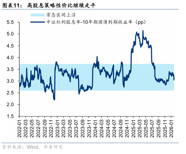 Currently, the difficulty of further repairing market risk premiums has increased. Sharp fluctuations in cyclical stocks impact market profitability, and investor risk appetite may enter a “small plateau” phase with declining volatility. The cost-effectiveness of high-dividend strategies is further enhanced, with a focus on stable dividend-paying stocks with defensive attributes and some potential dividend stocks in consumer sectors. From a short-term multi-dimensional perspective, the allocation attractiveness of high-dividend assets has rebounded compared to December 2025: 1) The difficulty of further repairing market risk premiums is high, and high-dividend assets have defensive allocation value. Currently, the All-A ERP is located below the five-year average by one standard deviation; historically, breaking through this level requires fundamental repair or strong liquidity support, both of which are not highly visible now. Investor risk appetite may enter a volatile phase, increasing the defensive value of high-dividend strategies; 2) From a quantitative perspective, the high-dividend signal system based on the sector’s own trend (flat), interbank market turnover (bullish), and term spread (flat) has shifted from neutral to bullish; 3) With the announcement of the new Federal Reserve Chair candidate, the recent rebound in the U.S. dollar index and U.S. Treasury yields. Looking ahead, the insurance dividend strategy 2.0 era needs to balance high dividend yields with cost-effectiveness. Considering current trading congestion, chip levels, and profit expectations, focus on stable high-dividend stocks with defensive attributes (utilities, insurance, publishing, etc.) and some potential dividend stocks (railways, environmental protection, Hong Kong stocks, real estate, etc.).