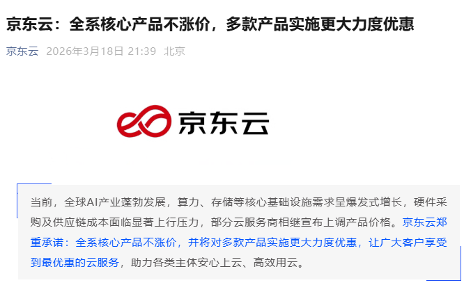 On the evening of March 18, JD Cloud issued a statement promising that all core products will not see price increases, and will implement greater discounts on multiple products to help various entities confidently adopt cloud services and use cloud efficiently.
