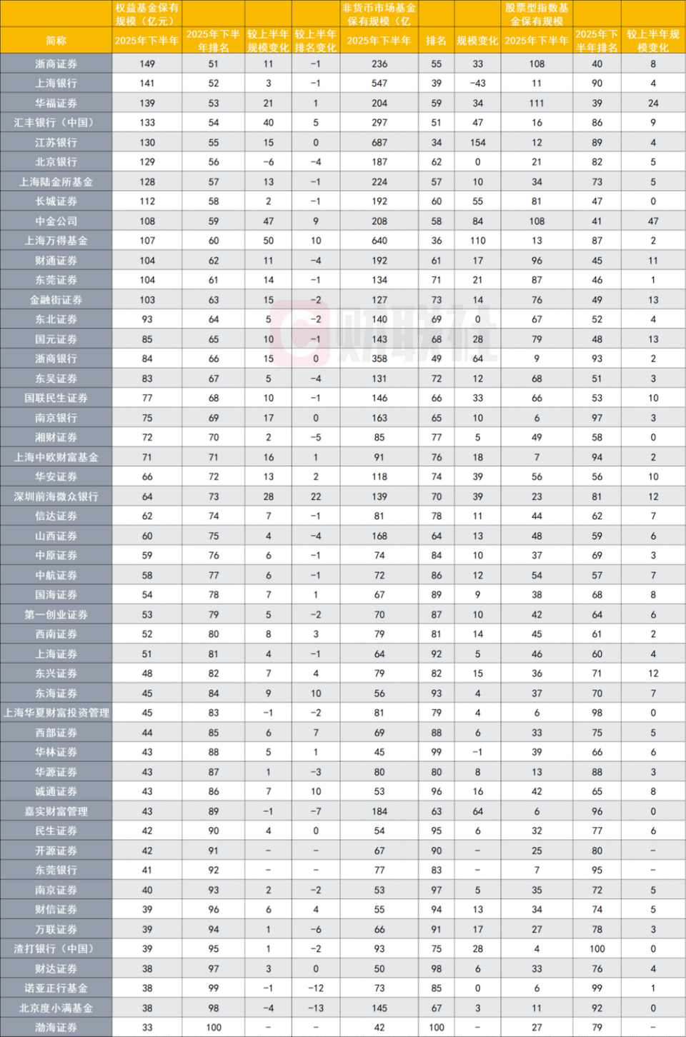 The latest list is composed of 57 securities firms, 25 banks, 14 third-party institutions, 4 fund subsidiaries, and 1 insurance company. Compared to the first half of last year, three new players—Yuanquan Securities, Dongguan Bank, and Bohai Securities—joined the top 100; meanwhile, Lide Fund, Tianfeng Securities, and Guodu Securities temporarily dropped out.
