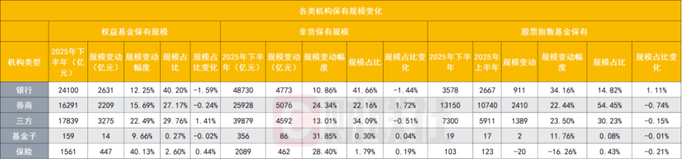Third-party institutions contributed the largest incremental growth in equity fund holdings last year’s second half, adding over 320 billion yuan. This increased their share among the top 100 equity fund holders by more than 1 percentage point. Meanwhile, the market share of banks, securities firms, and fund subsidiaries slightly declined, though banks still account for over 40%.