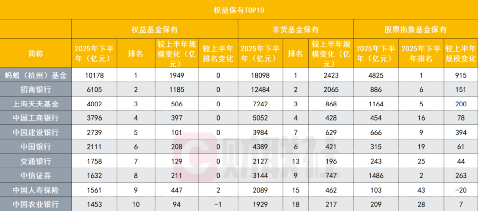 Under the intensifying Matthew effect, the top ten institutions in equity fund holdings have shifted again, with insurance companies entering the list and one securities firm temporarily dropping out.