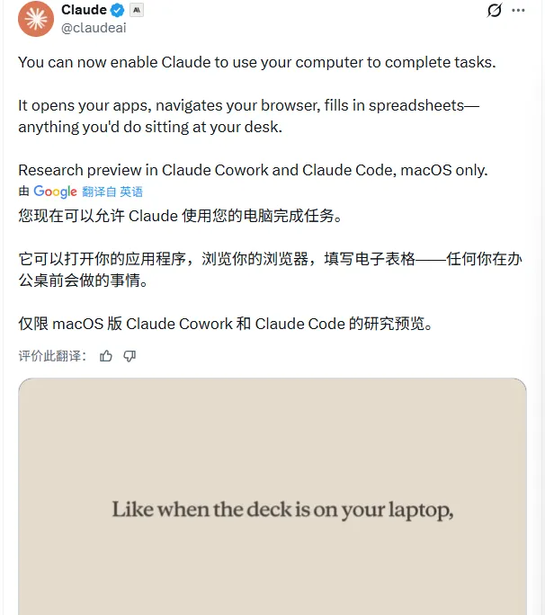 On March 24, Anthropic announced that Claude has gained “Computer Use” capabilities, allowing Claude to directly operate users’ Macs within Claude Cowork and Claude Code—opening files, using browsers, running development tools—all without any configuration. This feature is available in research preview to Pro and Max subscription users.