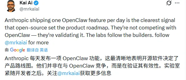 This reveals a harsh but effective survival rule in the current AI landscape: open-source projects handle the mine-clearing in uncharted territories, while commercial companies rapidly productize validated pathways. As discussed widely on social media, “Anthropic is almost daily porting OpenClaw features, and open-source software is shaping the product roadmaps of major tech companies.”