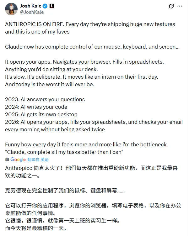 “In 2023, AI was answering questions; in 2024, AI was coding; in 2025, AI moved into desktop computers. By 2026, it’s waking up on time, opening apps, filling forms, and replying to emails daily. Watching it work so efficiently, I feel like I’ve become the bottleneck holding back progress.”
