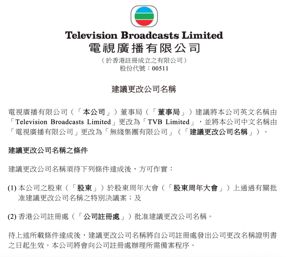 On March 25, Hong Kong Television Broadcasts Limited (TVB) (00511.HK) announced that to reflect the group’s development of multi-platform and diversified business strategies in line with global media market trends, the board of directors proposed changing the company’s English name from Television Broadcasts Limited to TVB Limited, and the Chinese name from “电视广播有限公司” to “无线集团有限公司”.
