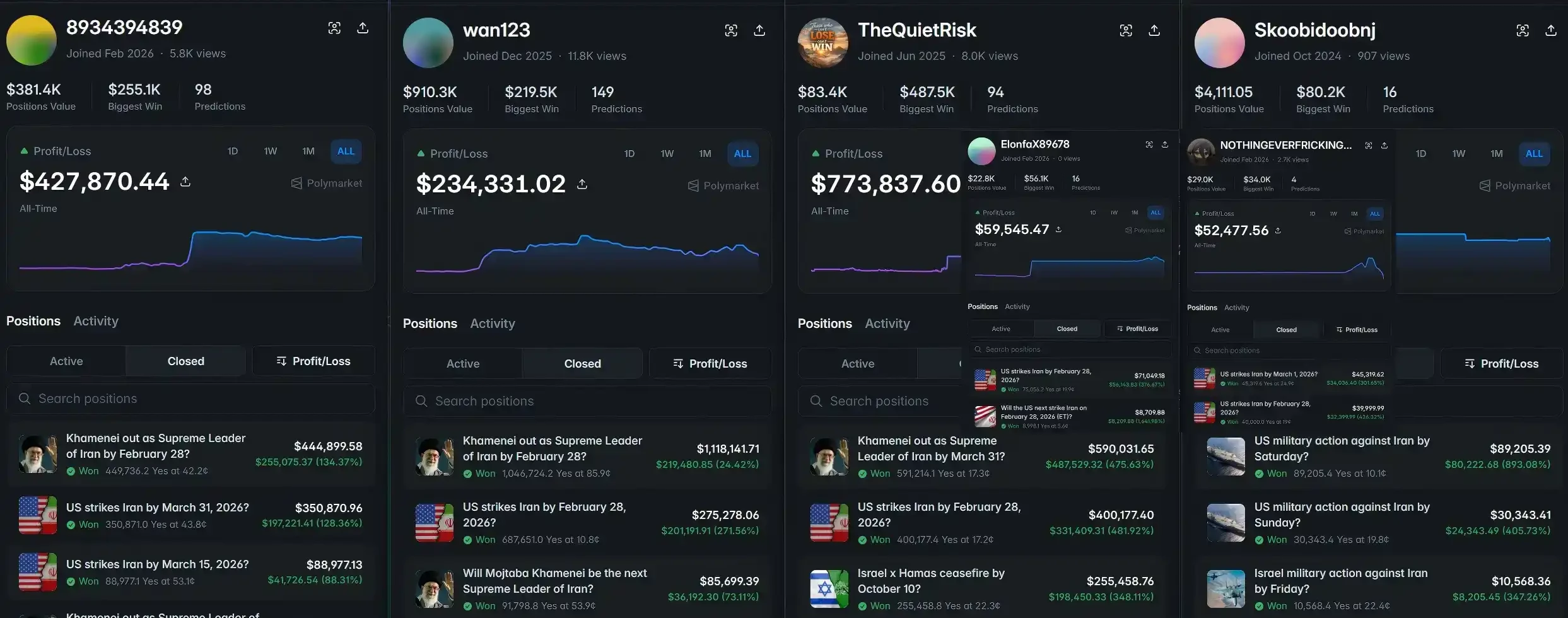 But among these “gamblers,” there have appeared six accounts that look highly suspicious. Their total profits of $1.8 million all came from accurately predicting the time nodes during 2025 for “U.S.-Israel strikes against Iran” and the “Israel-Hamas ceasefire,” as well as the outbreak time of this Iran conflict and the assassination of Iran’s former top leader Khamenei