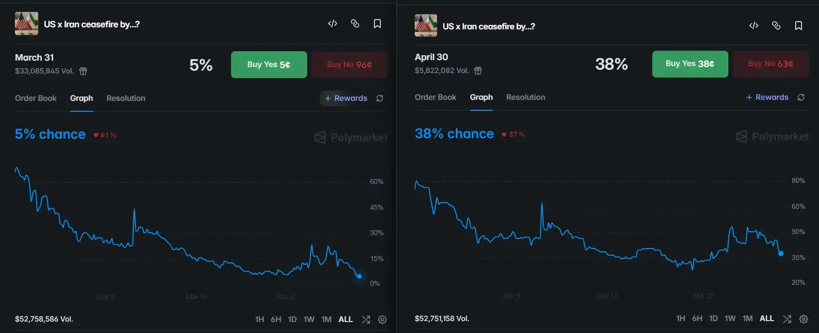 In prediction markets, there is a trading event created only 3 weeks ago, with trading volume exceeding $50 million: “Will the U.S. and Iran ceasefire by ___ Month ___ Day.” If two people who hold different views about this market can reach agreement on “probability,” then matched trades will form along with the corresponding event occurrence probability.
