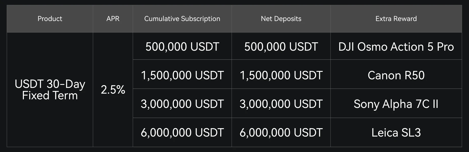 8. Para regiões onde não é possível entregar recompensas físicas, estas serão concedidas em USDT equivalente. Os valores em dinheiro são: 288 USDT (DJI Osmo Action 5 Pro), 870 USDT (Canon R50), 2.030 USDT (Sony Alpha 7C II) e 5.610 USDT (Leica SL3).