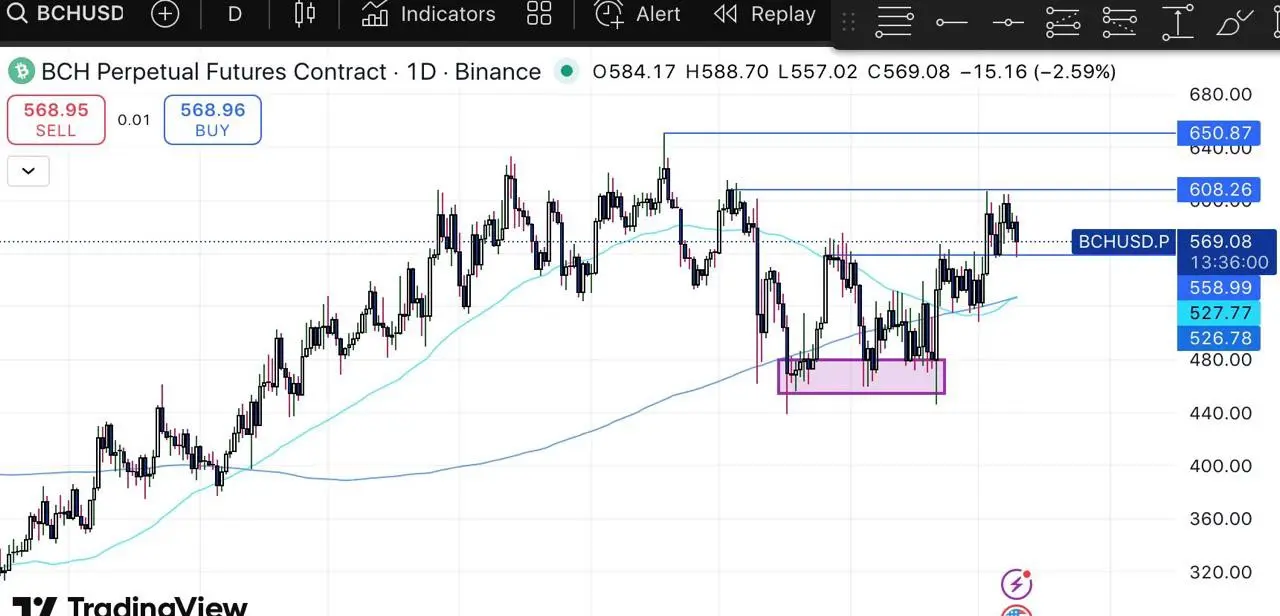 Um fechamento diário acima de $608 pode abrir caminho para a região de $650 . O ativo se beneficia do interesse mais amplo em cadeias de liquidação mais rápidas e sistemas de pagamento alternativos.