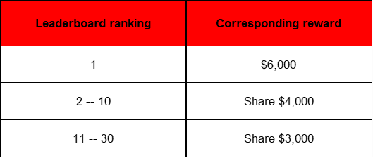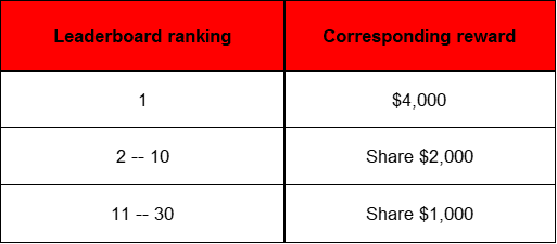 All users who have completed at least $10,000 worth of trades on any trading pair on Gate during the event period will be eligible to participate in the trading leaderboard. Gate will rank users based on their total trading volume during the event, and the top 30 users who enter the contract and spot leaderboards will be eligible to receive rewards according to the reward structure below.