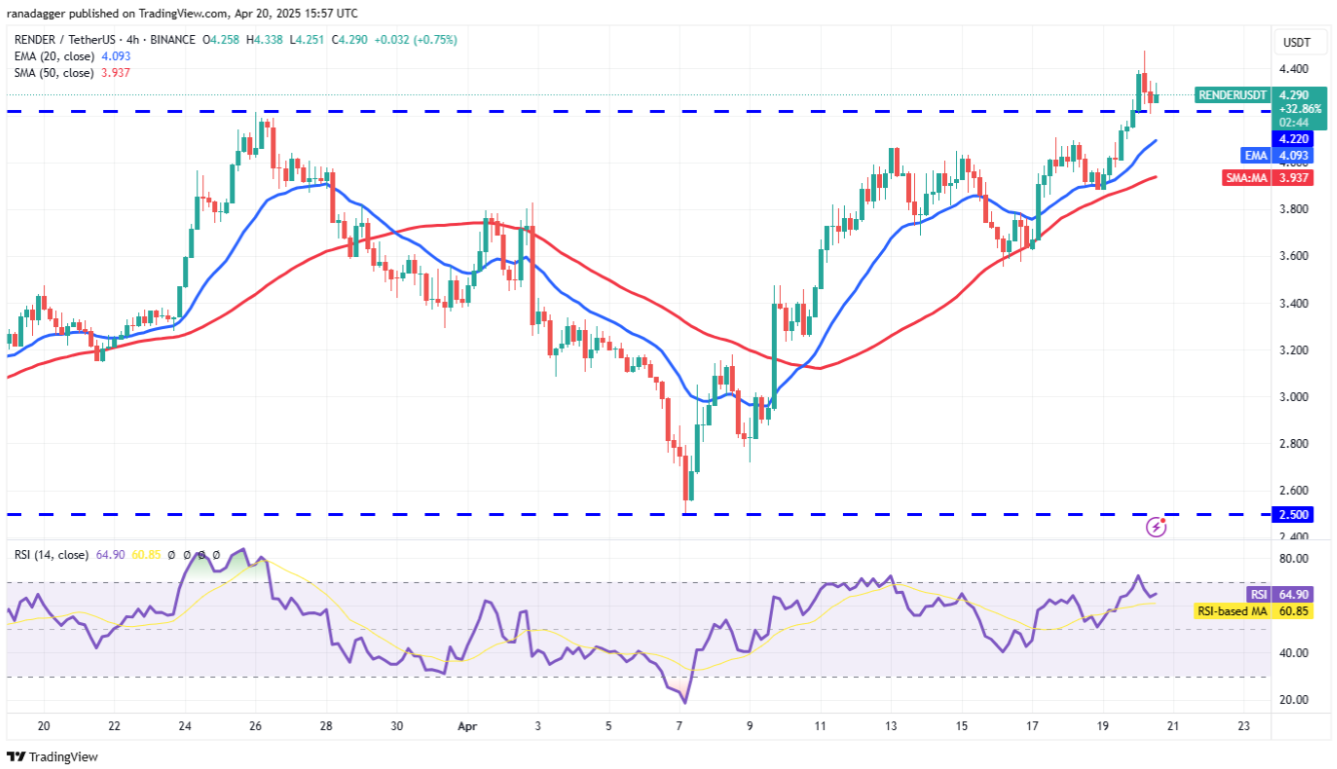 ! 4-hour frame gráfico RNDR/USDT | Fonte: TradingViewA quebra da barreira aérea de US$ 4,22 demonstra uma vantagem a favor dos touros. No entanto, os ursos não vão desistir facilmente e podem tentar puxar o preço de volta abaixo da zona de breakout. Se o preço se recuperar acentuadamente de US$ 4,22 e quebrar acima de US$ 4,48, isso indicará que os touros transformaram a zona de resistência em suporte. Nesse momento, o rali pode ser estendido para a área de US $ 5.