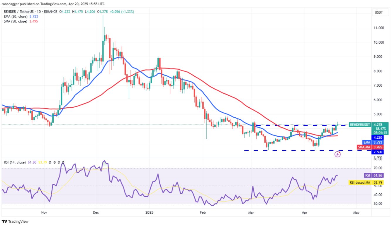 Render (RNDR) ultrapassou o nível de resistência superior em $4,22, mostrando que os touros estão se esforçando para voltar ao jogo.