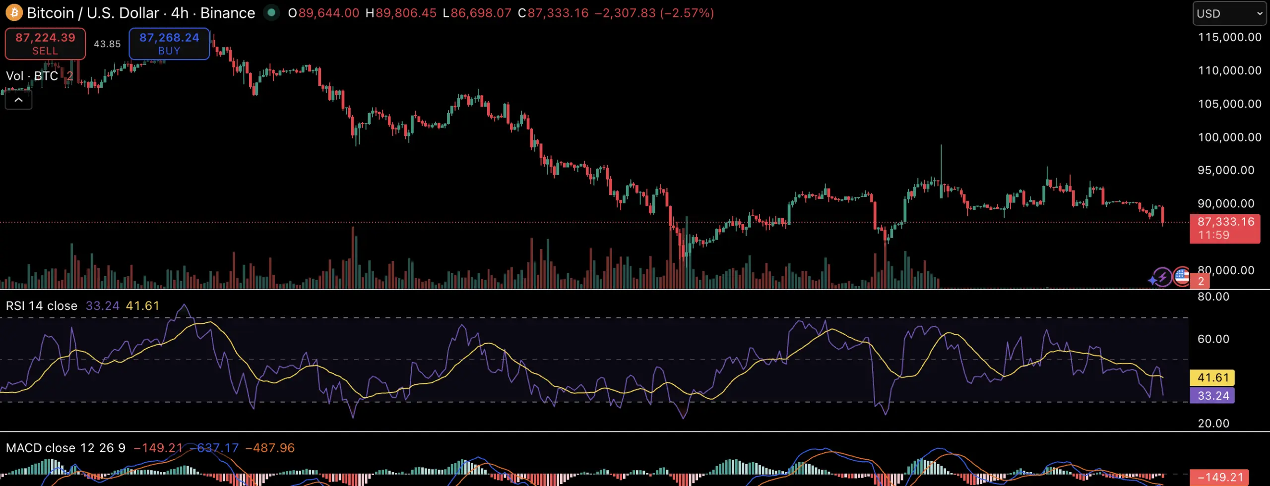 O Bitcoin está a negociar perto de $87.000 após uma renovada pressão de venda no gráfico de 4 horas
