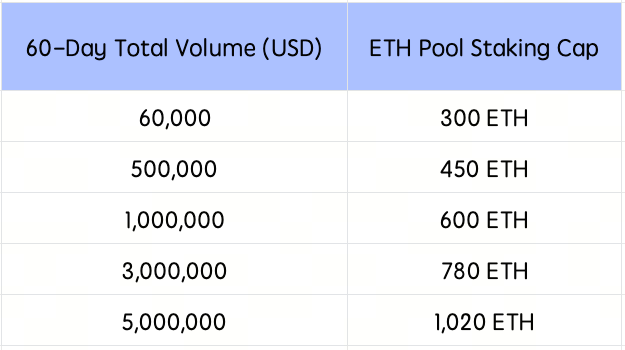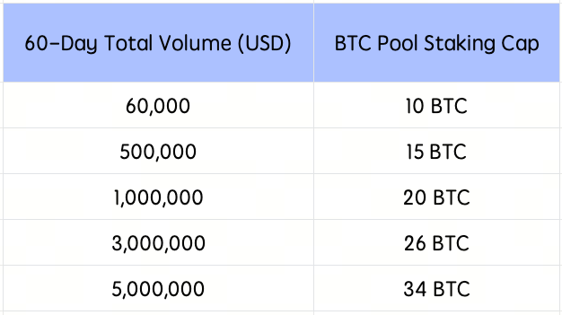 Ваш лимит стейкинга определяется вашим 60-дневным совокупным торговым объёмом. Достигайте большего объёма торгов, чтобы разблокировать более высокий лимит стейкинга.