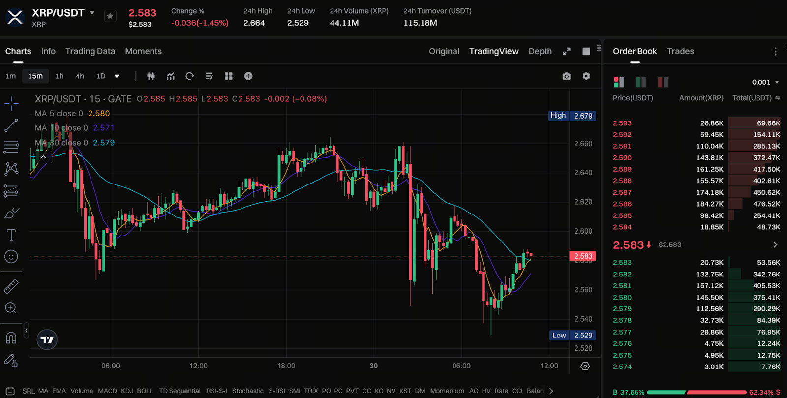 В последние сутки XRP предпринял попытку восстановления, но затем курс заметно скорректировался — снижение превысило 1,4 %, торговля ведется около $2,58 USD.