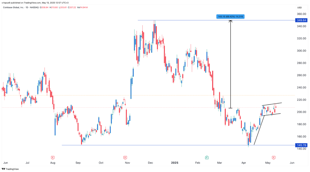 Ежедневный график показывает, что цена акции COIN достигла минимума в $145.78 в апреле. Это был заметный уровень, поскольку он совпал с ее самым низким значением в сентябре прошлого года. Акции теперь образовали бычий флаг, популярный знак бычьего продолжения. Они также поднялись выше 50-дневной и 100-дневной скользящей средней.