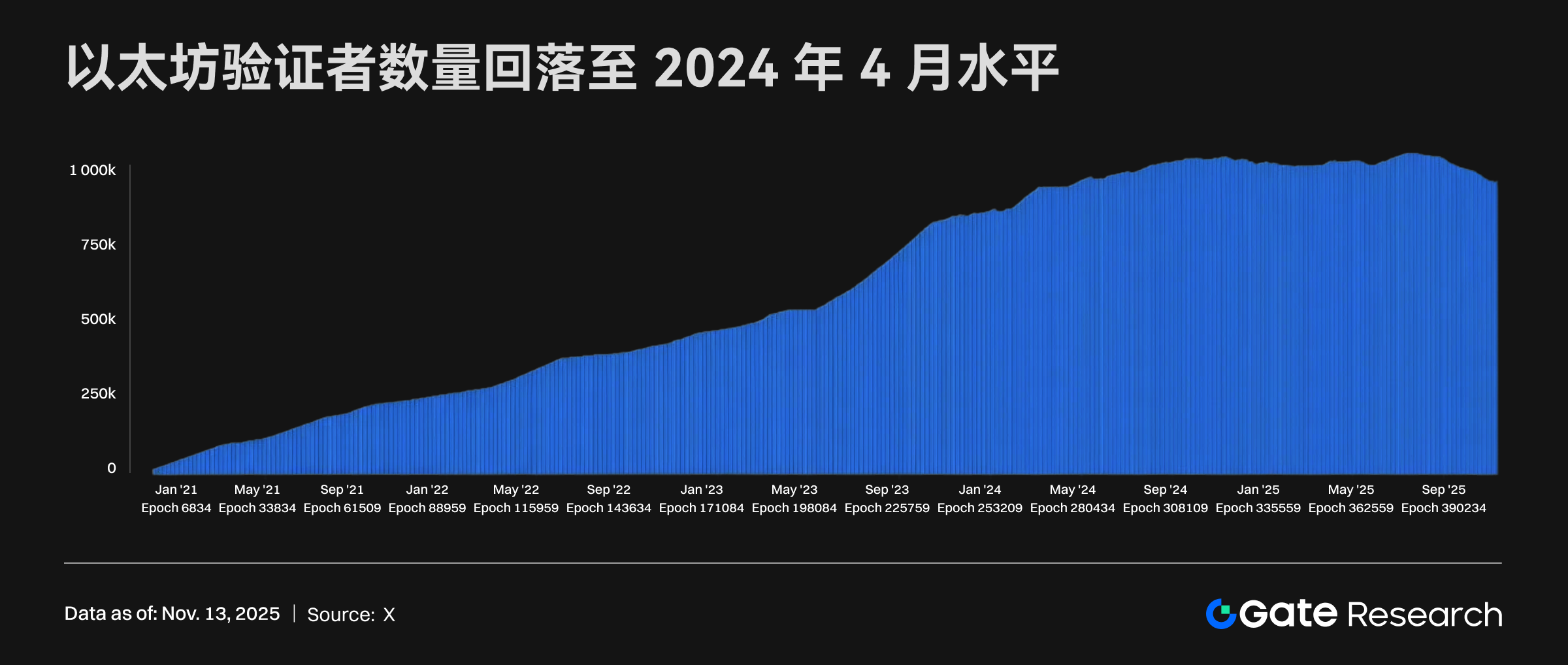 Цей феномен свідчить про те, що мережа Ethereum, ймовірно, переживає перехід від стадії “розширення” до стадії “інтеграції”. З точки зору безпеки мережі, хоча механізм виходу призначений для запобігання одночасному виходу великої кількості валідаторів, що може вплинути на консенсус, зниження активності валідаторів і збільшення часу очікування виходу також можуть послабити участь у мережі та рівень децентралізації, що в довгостроковій перспективі може негативно вплинути на стабільність Ethereum та довіру до екосистеми. Крім того, зростання виходу валідаторів може відображати те, що деякі оператори вузлів вирішують вийти через зниження доходів, зростання витрат або потребу в оптимізації протоколу, що вказує на те, що екосистема стейкінгу може стикатися з викликами в плані зниження дохідності та зміни структури учасників.