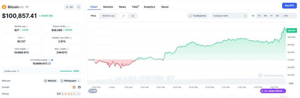 Згідно з CoinMarketCap, Біткойн зріс більш ніж на 4%, торгуючись за $100,857.41, що відображає відновлення бичачого імпульсу в провідній криптовалюті.