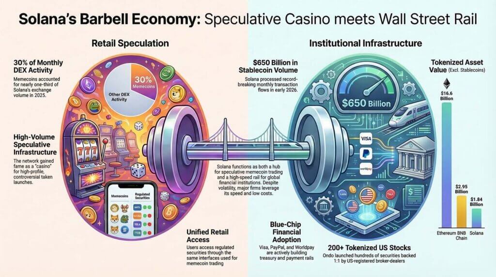 Інфографіка, що показує «бабл-економіку» Solana: з роздрібною спекуляцією зліва і інституційною токенізованою інфраструктурою справа, з’єднаними штангою.