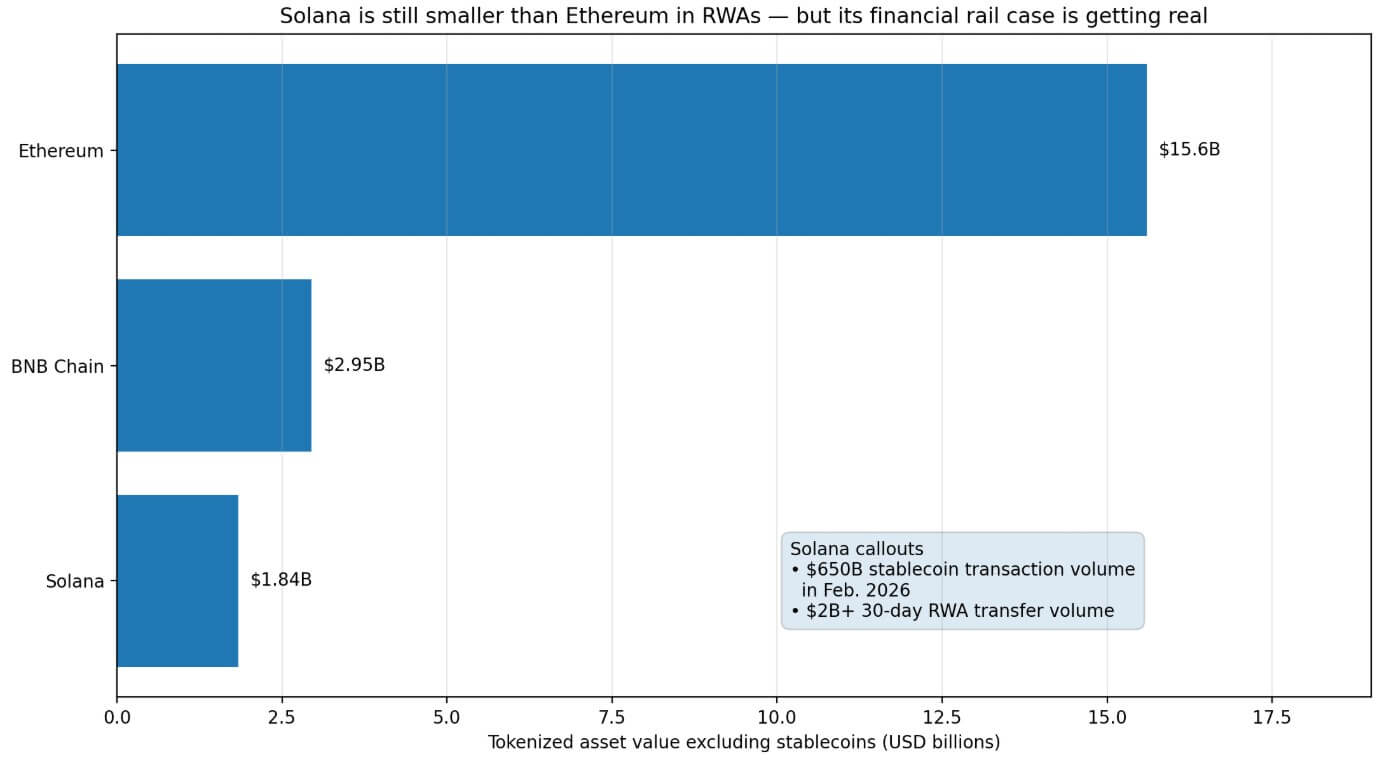 За даними RWA.xyz, Ethereum зберігає близько 15,6 мільярдів доларів у токенізованих активах без урахування стабількоінів, тоді як Solana — 1,84 мільярда доларів. BNB Chain посідає проміжне місце з приблизно 2,95 мільярда доларів.