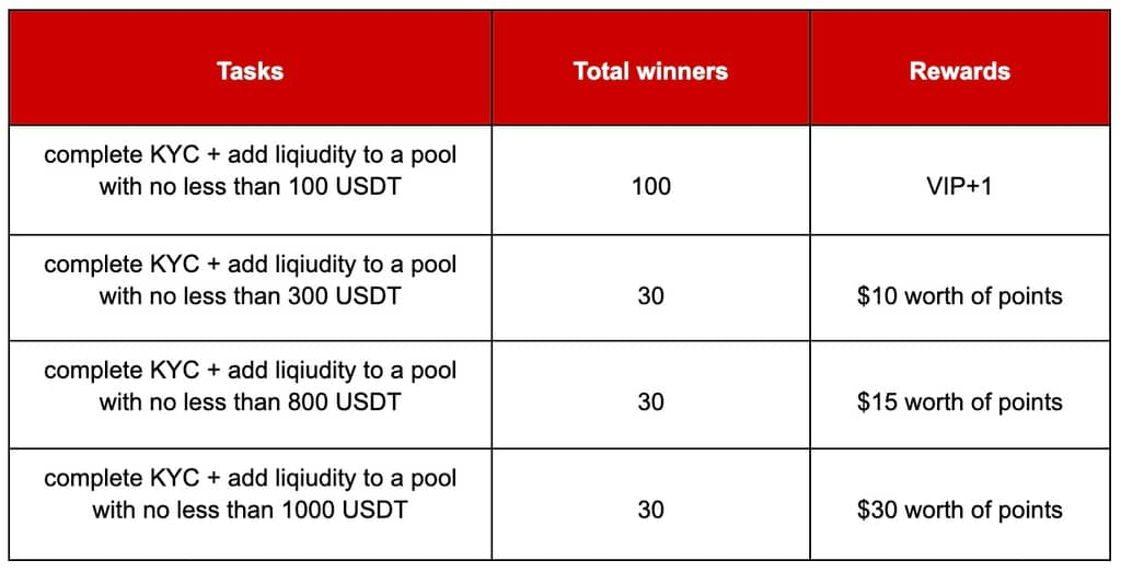 30 người Hoàn thành KYC + thêm thanh khoản đến một nhóm trị giá ít nhất 1000 USDT: : Points trị giá 30 USD
