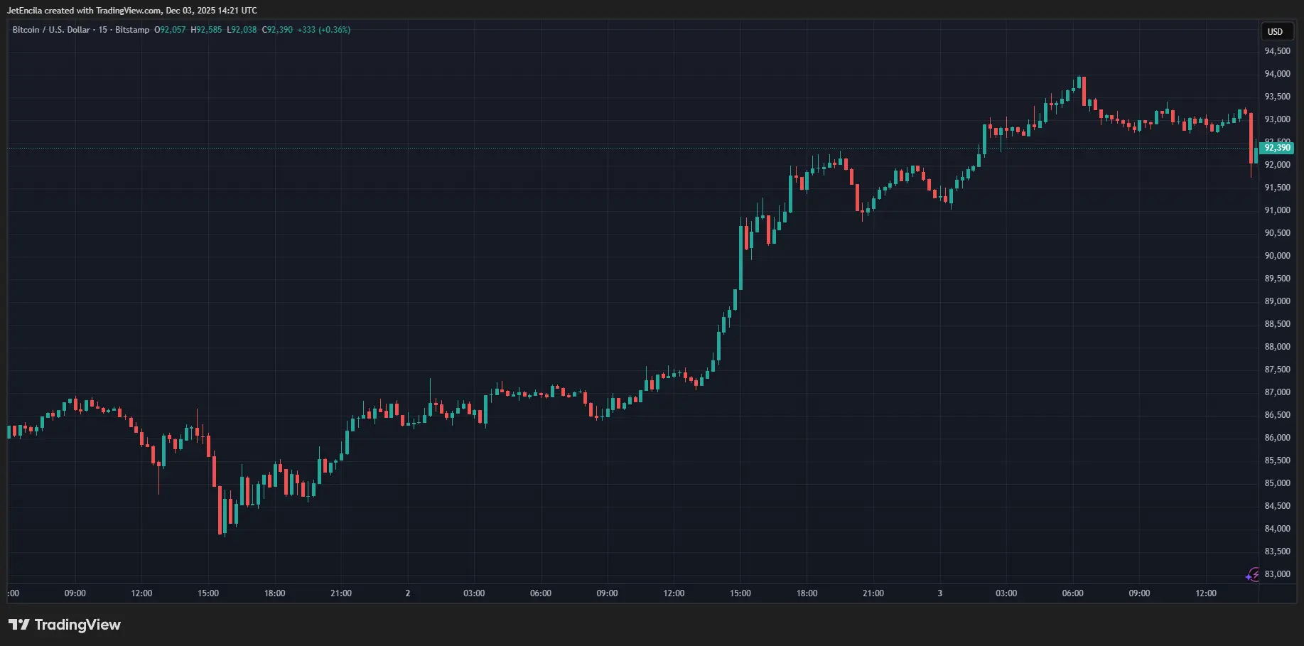 BTCUSD hiện đang giao dịch ở mức $92,390. Biểu đồ: TradingView