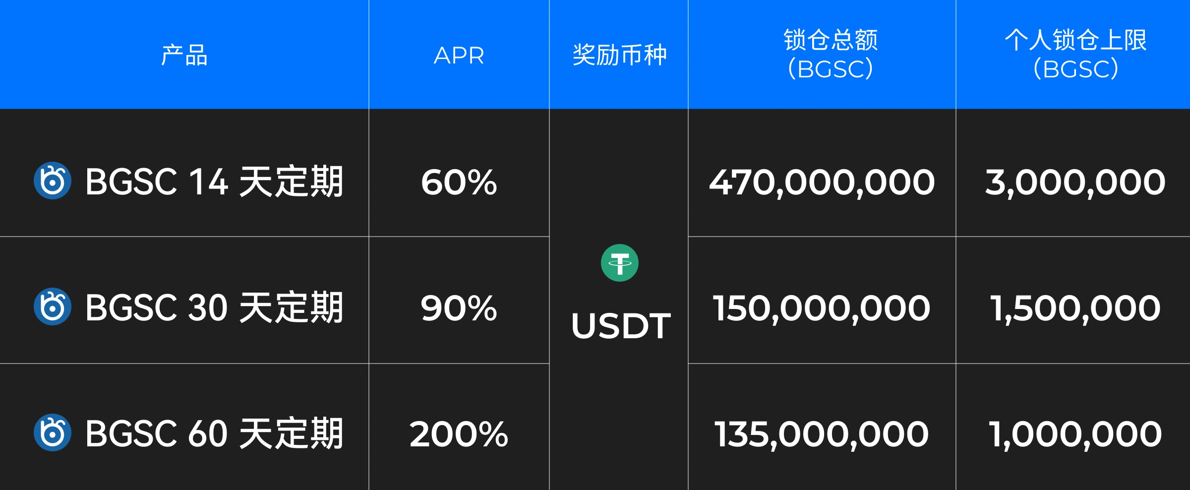 Gate 理财宝独家上线 BGSC 定期理财产品,并提供 14 天、30 天、60 天多种期限可选,年化高达 200%。申购成功后 24 小时内即可获得全部 USDT 收益,锁仓时间越长收益越高。立即申购,轻松赚取高额 USDT 回报。