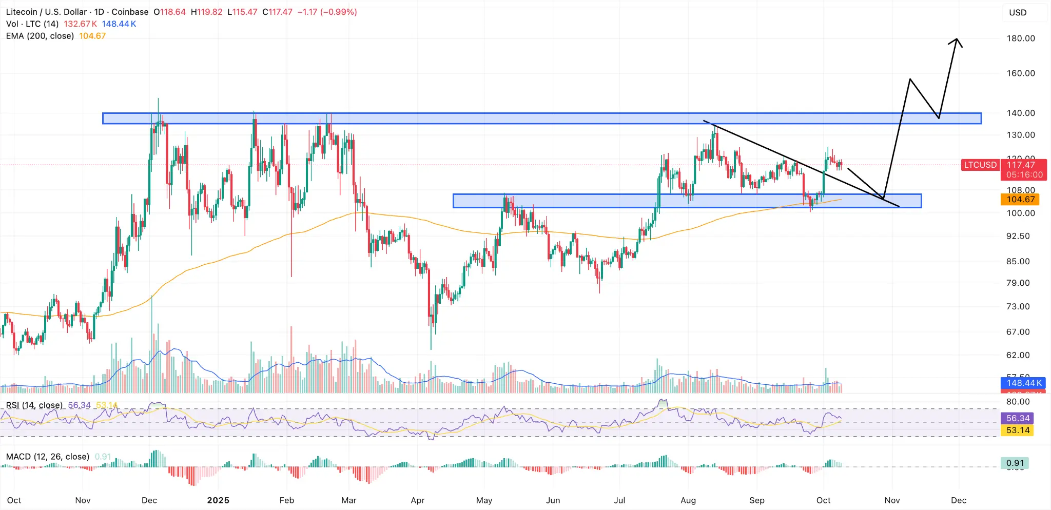 萊特幣 ETF 可望下週啟動!LTC 價格預測:突破趨勢線衝向 200 美元