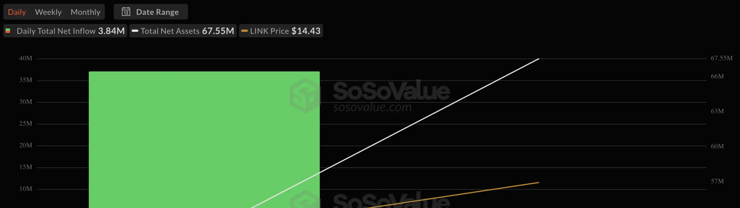 進一步推動近期動能的是新推出的Grayscale Chainlink Trust((GLNK))上週於NYSE Arca掛牌交易。該ETF由封閉式基金轉換而來,上市首日流入$15 百萬美元,12月3日再流入$3.84百萬。截至目前,管理資產總額約為$67.55百萬。