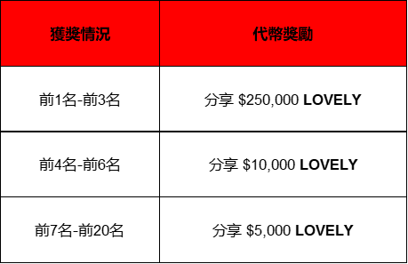 你可以在社交媒體上分享本次活動的海報,截圖並提交給表格。有效總交易量(買入+賣出)不低於1個LOVELY,就可以參與分享相當於1萬美金的LOVELY代幣獎池。