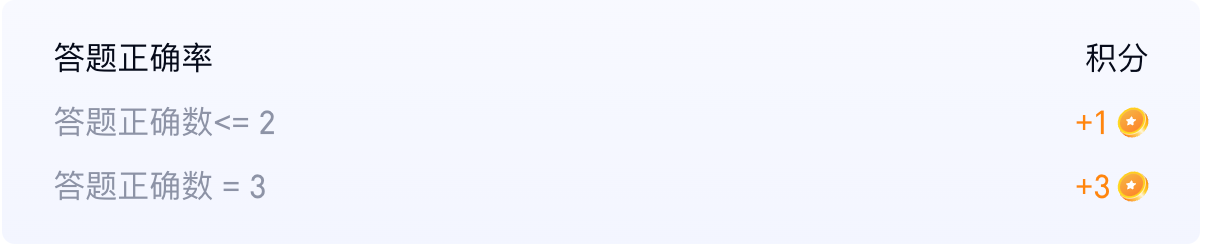 1.答题正确数<= 2,则积分+1;答题正确数 = 3,则积分+3(每天最高3分);