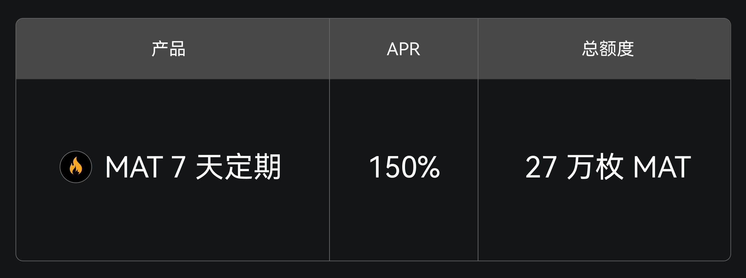 Gate 余币宝现已上线 MAT 7 天定期理财,年化收益 150%,总额度 27 万枚 MAT,限量发售,先到先得。