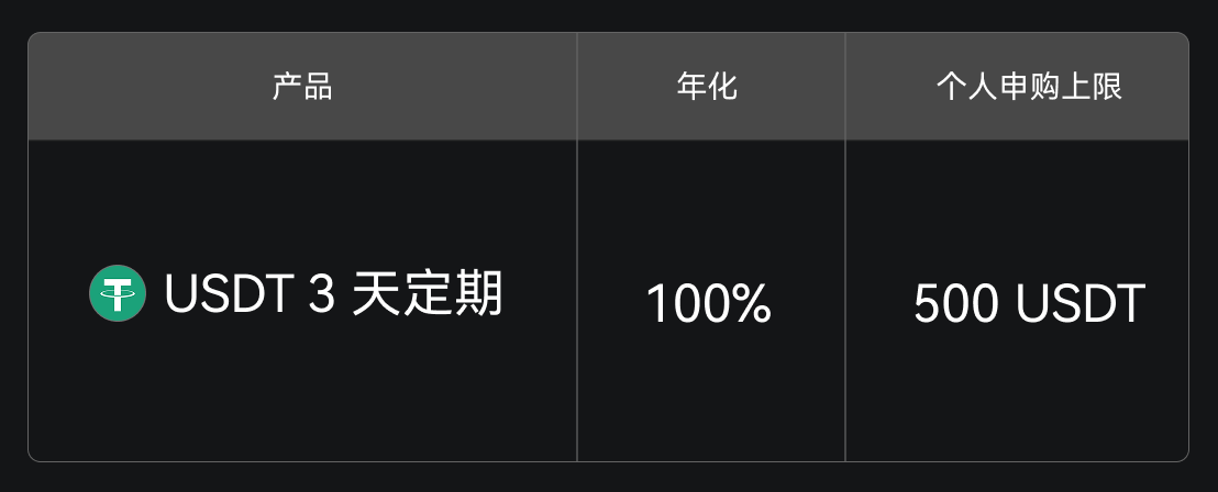 Gate 余币宝限时推出新人专属理财福利,新用户申购 USDT 3 天定期理财产品,即可享受 100% 年化收益。