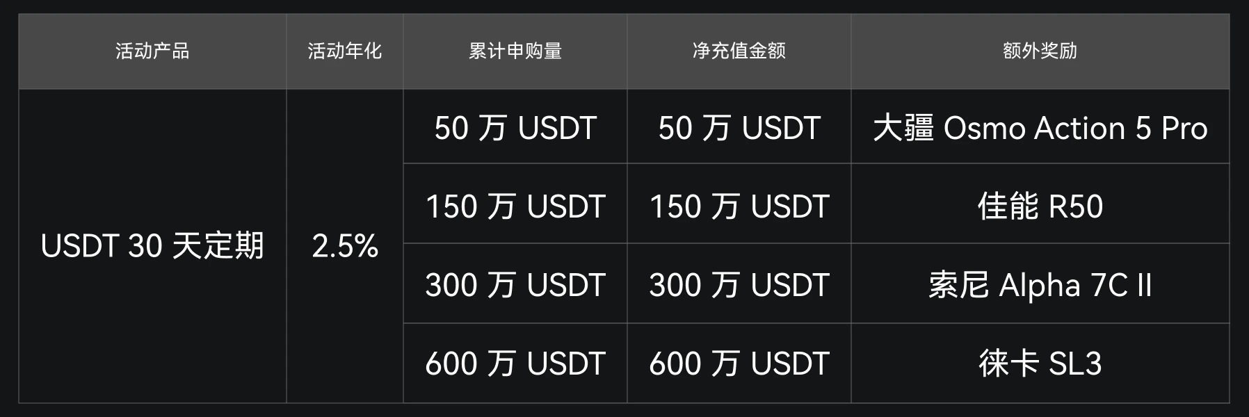 8. 实物无法送达地区,奖励可折算为等值 USDT 发放,大疆 Osmo Action 5 Pro、佳能 R50、索尼 Alpha 7C II、徕卡 SL3 对应的折现金额分别为 288 USDT、870 USDT、2030 USDT、5610 USDT;