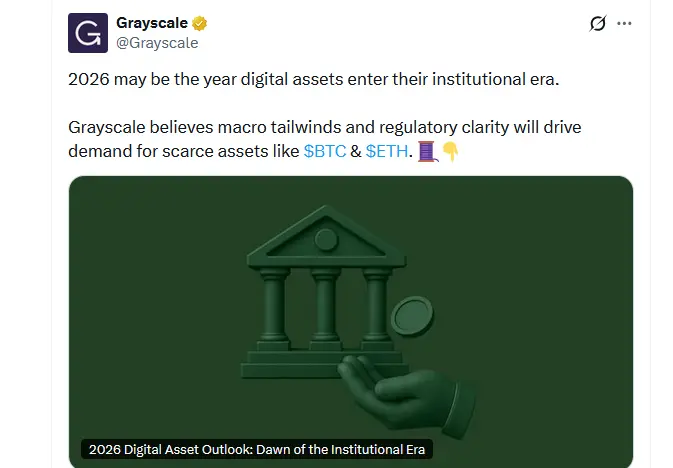“在2024年,比特币和以太坊现货ETP进入市场。2025年,国会通过了关于稳定币的GENIUS法案,监管机构对加密行业的态度也发生了变化,开始与行业合作提供明确的指导,同时继续关注消费者保护与金融稳定,”Grayscale表示,并补充道: